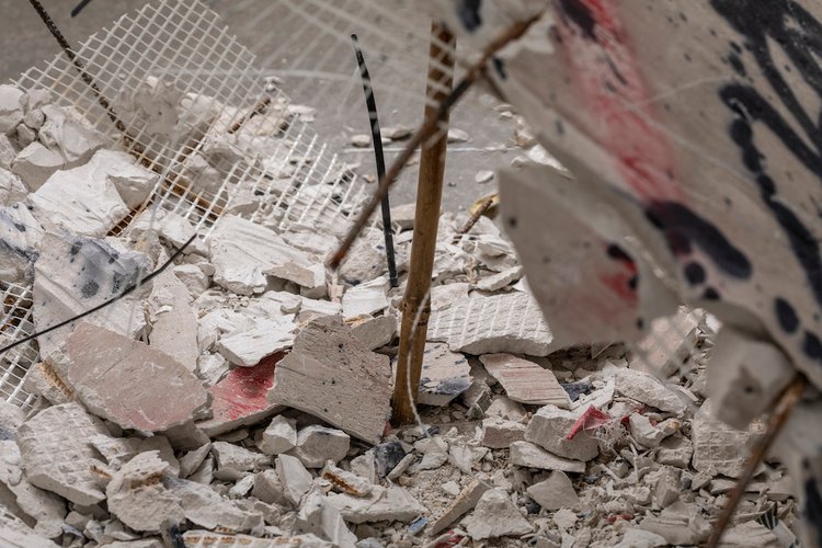 Med deres taktile registreringer af omgivelserne minder Jóhan Martin Christiansens værker om, at vores adgang til verden først og fremmest går gennem sanserne; at alt det, vi husker og ved, er rodfæstet i materien. I selv de mest undseelige materialer sættes aftryk af tiden, af handlinger, af vind og vejr, som kunstneren på forskellig vis kalder frem og lader indgå som en poetisk hvisken i sine abstrakte arbejder, der med et performativt islæt kredser om kroppen, erindringen og forfaldet. Disse spor mødes i værket De første dage. Vi falder, hvor en opbrækket gipsflade kun netop holdes oprejst af armerings net og en enkelt bambusstang, som på brutal vis er stukket gennem konstruk tionen. På det formelle plan granskes forhold som tyngdepunkt og balance, ligesom skulpturens krop med sine tydelige spor af proces peger tilbage på kunstnerens og den fysiske skabelsesakt. Med sin slagne, ruinøse fremtoning vækkes dog også associationer til en skikkelse i knæ eller et smadret bygnings fragment. Ved et nærstudie af den delvist bemalede overflade skimtes afstøbninger af årestrukturerne i en frønnet træplade, tilfældigt påførte snit samt udviskede avisudklip, der med ikoniske symboler på vestlig kultur fremstår som vage genskin af fordums storhed; som et varsel på eller levn fra aftenlandets undergang. Værket lukker således op for en civilisationskritisk læsning, som med titlens bibelske allusioner knytter an til myterne om syndefald og genesis.